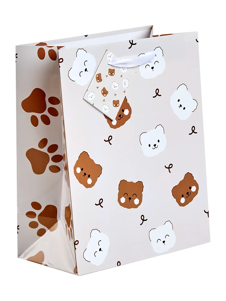 This cheerful paper gift bag features a light background with a playful pattern of expressive brown and white bear faces, alongside small brown paw prints. Crafted from durable paper, it includes white ribbon handles and a coordinating gift tag, with larger brown paw prints decorating the side panels.