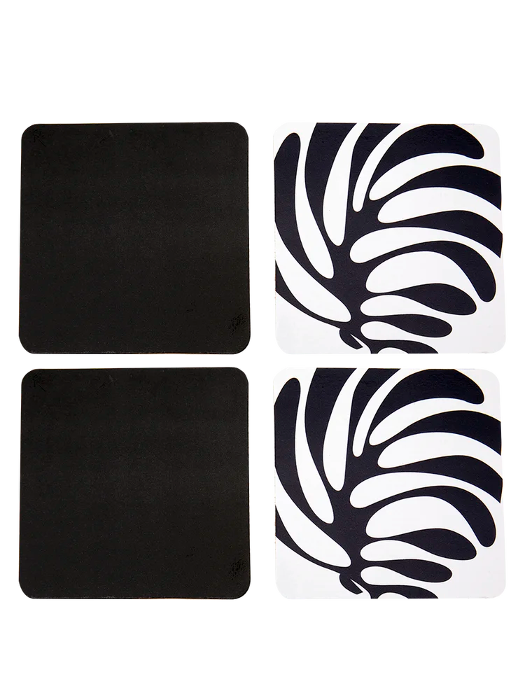 Protect your surfaces with this stylish set of four wooden coasters. Two are sleek solid black, and two boast a dynamic black and white swirling leaf pattern. These durable, square wood coasters with rounded corners bring a modern, welcoming touch to any home. Enjoy better protection and vibrant style.