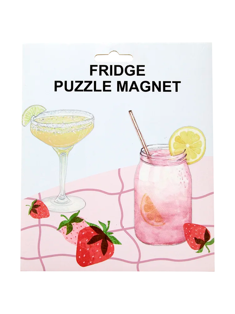 This vibrant puzzle magnet set displays a cheerful illustration of a yellow cocktail, a pink lemonade drink in a jar, and ripe strawberries on a lively pink checkered background. Crafted from durable magnet material, each piece creates an engaging visual with its vivid, detailed scene and clean white reverse side.